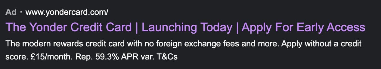 We had a website with a waitlist (probably write another post on this tbh) and one of our goals was to drive people there as best we could. Yonder is a popular name–there’s a climbing gym, a consulting business, and a few travel companies with the same name. And while press is great, they don’t typically link to your website directly. What you’ll find is that people read an article about you at their desk, open up a new tab, type in your company name and try and find you that way. We bought some brand search terms on Google with messaging around “Launching today” so we could bridge the gap between our press coverage and our actual website. If you searched “Yonder”, “Yonder card”, “Yonder credit card” or anything else like that on our launch day you’d have seen this ad below. We did the same with App Store ads, assuming some people might just go straight to download our app.